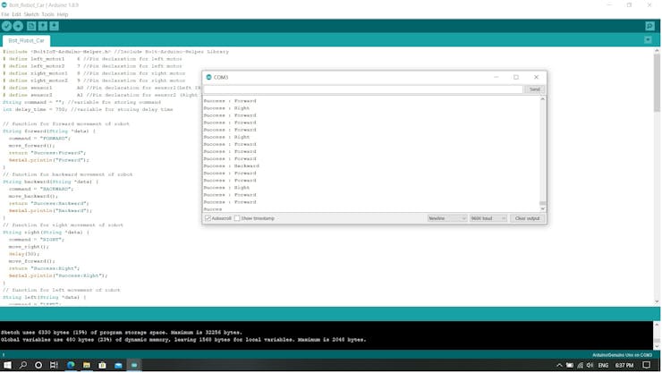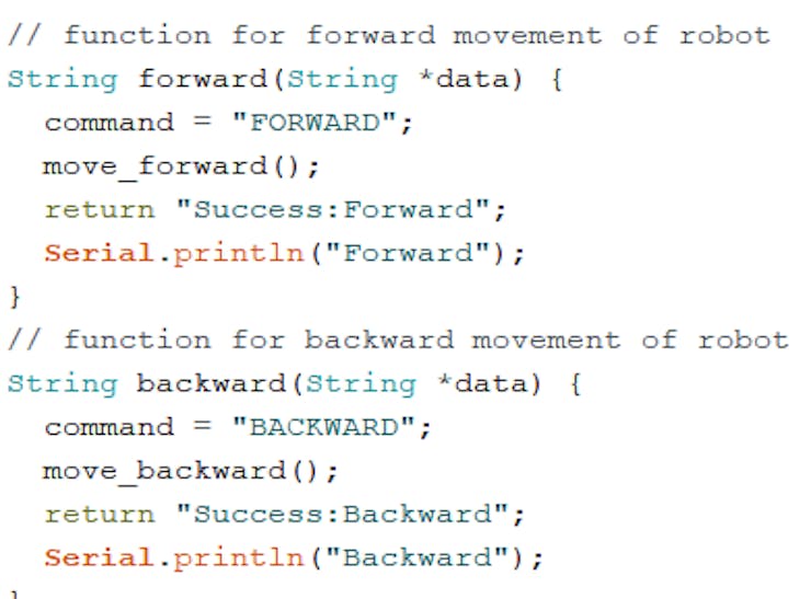 Here command function whenever received specified command it calls particular Motor Control Function like if it received the command "FORWARD" it then call move_forward() function and return "Success:FORWARD" message and also print this message on the serial monitor.