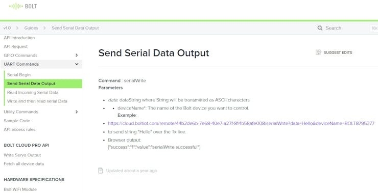 you can find the required HTML code for this in the Code Section with an explanation. Here we Use Bolt UART API for 'Sending Serial Data Output'
