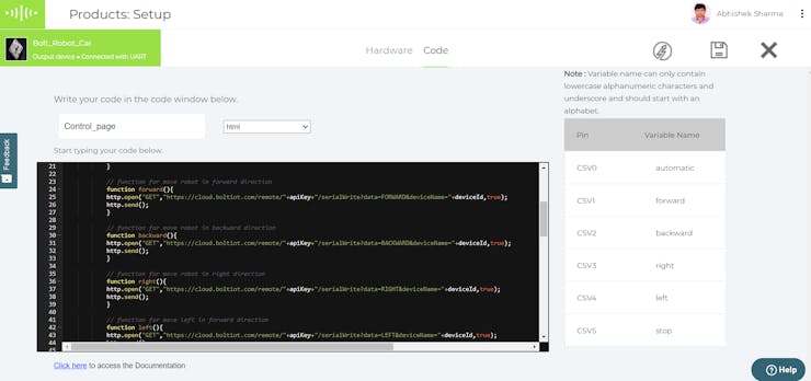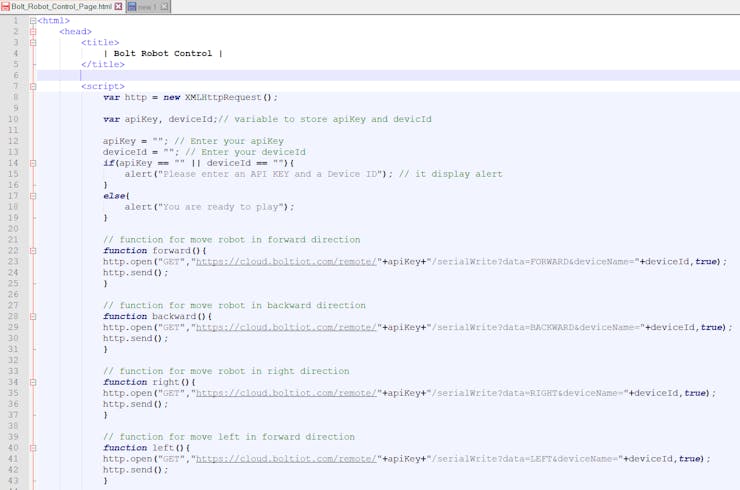 4.1.2 Now go to the Code section, Here you have to write HTML code to design an Interface webpage that contains a control Button for Robot movement control. Here we also use Javascript and Bolt Cloud UART Serial Data Transmitter API for sending the required data to Bolt Wi-Fi module TX Pin, Which is then Received by Arduino RX Pin. You need your BOLT CLOUD API KEY And DEVICE ID here.