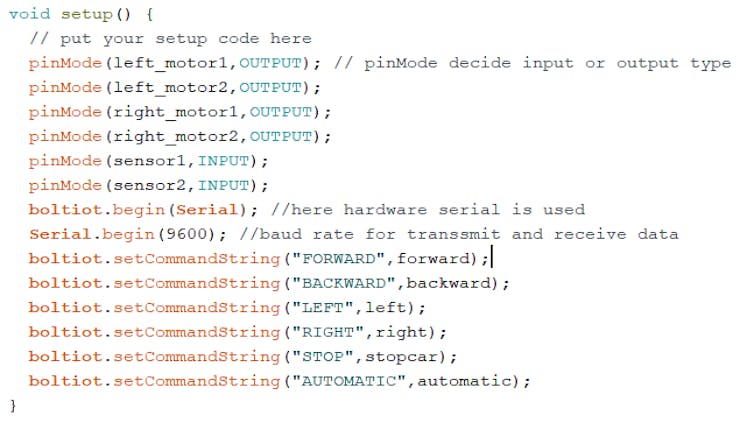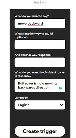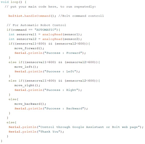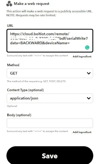 we have to make 6 URLs for controlling our device for different work. URL looks as https://cloud.boltiot.com/remote/44b2de6b-7e68-40e7-a27f-814b58afe008/serialWrite?data=Hello&deviceName=BOLT8795377 Here data: data string where String will be transmitted as ASCII characters like in our case it is AUTOMODE, STOP, LEFT, RIGHT, BACKWARD, and FORWARD.