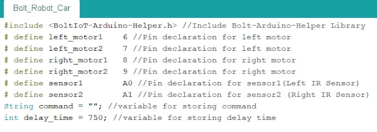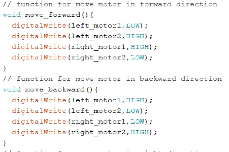 Here left_motor1, left_motor2 are two-terminal of DC motor. Connect all PINS according to this code.